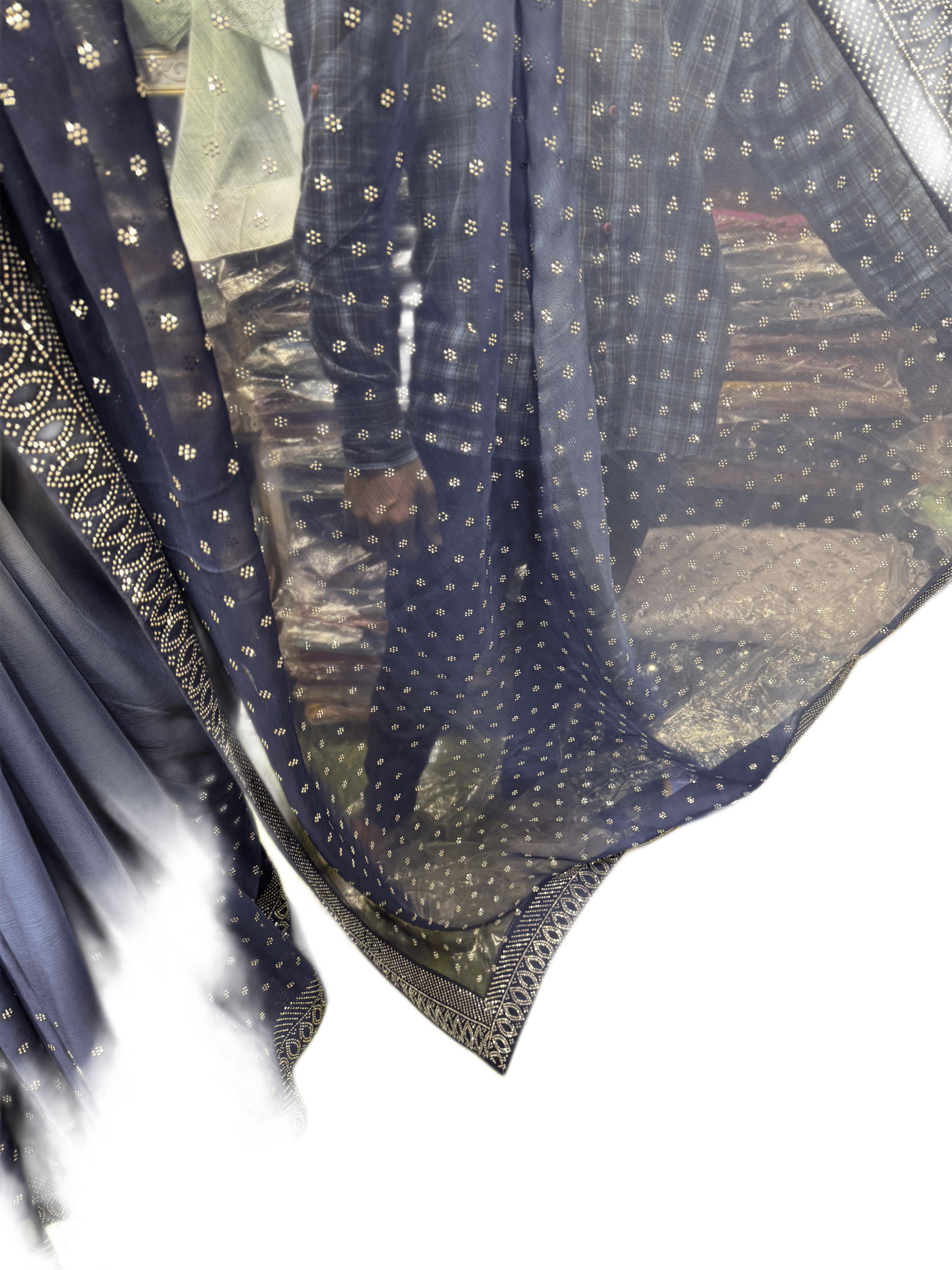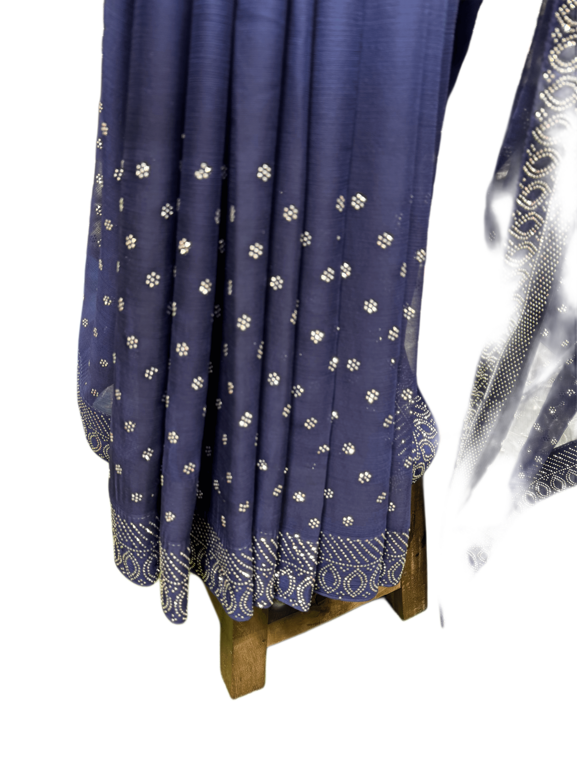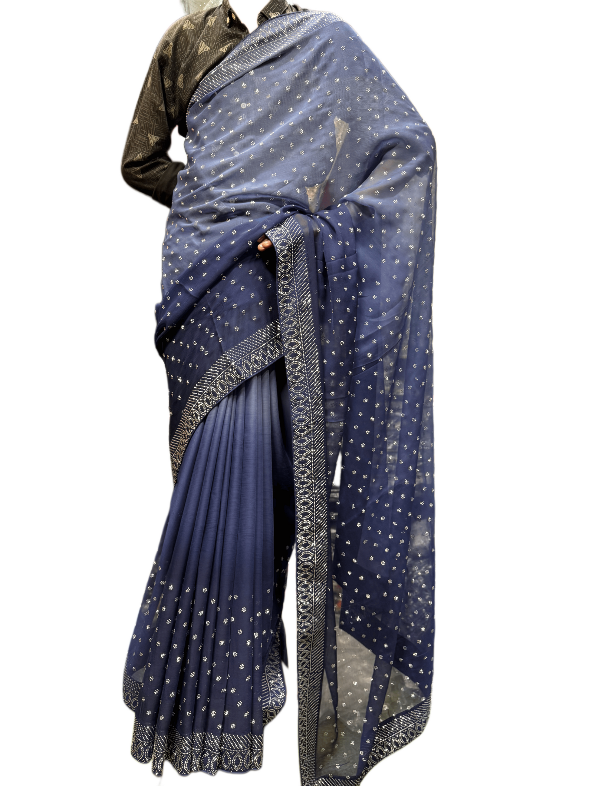 Pallu: Sheer chiffon pallu with dense rhinestone spray for a sparkling finish
