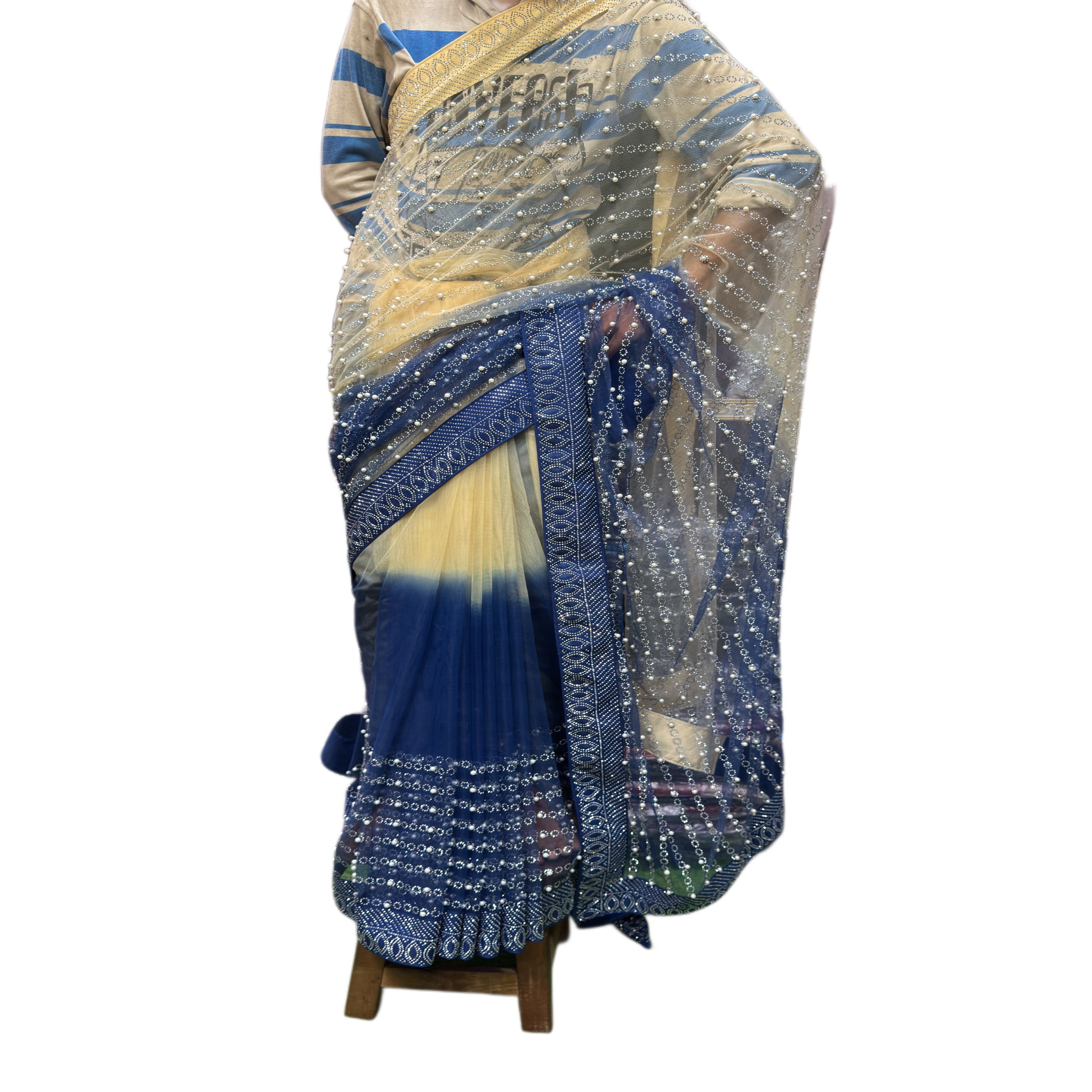 Pallu: Sheer net pallu with dense stone spray for a glamorous finish